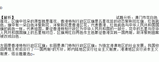 D ¡¾½âÎö¡¿ÊÔÌâ·ÖÎö£º°ÄÃÅÊл¨°×É«Á«»¨£¬ÇøÆìÖл¨¶äµÄÔÐ;ÍÊÇÁ«»¨£®Ïã¸ÛÌØ±ðÐÐÕþÇøÇøÆìÊÇÎåÐÇ»¨ÈïµÄ¶¯Ì¬×Ͼ£»¨ºìÆì£®ºìÉ«µ×É«£¬ÆìÖÐÓÐÒ»¶ä°×É«Ñó×Ͼ£»¨£®Ñó×Ͼ£»¨ÊÇÏã¸ÛÇø»¨£¬´ú±íÏã¸Û£®ºìÉ«µ×É«ÓëÖлªÈËÃñ¹²ºÍ¹ú¹úÆìµÄµ×ɫһÑù£¬´ú±í׿¹ú£¬ÏóÕ÷Ïã¸ÛÌØ±ðÐÐÕþÇøÎªÖлªÈËÃñ¹²ºÍ¹úµÄÒ»²¿·Ö£®»¨ÖеÄÎåÐÇÓëÖлªÈËÃñ¹²ºÍ¹ú¹úÆìÉϵÄÎåÐÇÏà¶ÔÓ¦£®ÇøÆìÓúì°×Á½É«×÷Ö÷É«ÏóÕ÷Ïã¸Ûʵ¼ùÒ»¹úÁ½ÖÆ£¬¹ÊÑó×Ͼ£Í¼°¸±»¸Ä³É°×É«£® ×óͼ...