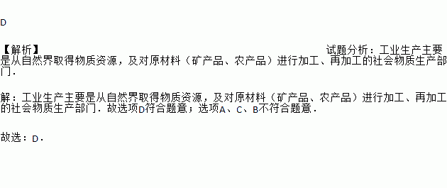D 【解析】试题分析:工业生产主要是从自然界取得物质资源,及对原材料(矿产品、农产品)进行加工、再加工的社会物质生产部门. 【解析】 工业生产主要是从自然界取得物质资源,及对原材料(矿产品、农产品)进行加工、再加工的社会物质生产部门.故选项D符合题意;选项A、C、B不符合题意. 故选:D.
