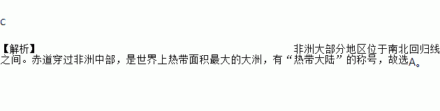 C 【解析】非洲大部分地区位于南北回归线之间。赤道穿过非洲中部,是世界上热带面积最大的大洲,有“热带大陆”的称号,故选A。