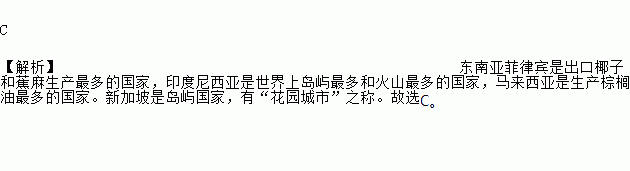 C 【解析】东南亚菲律宾是出口椰子和蕉麻生产最多的国家,印度尼西亚是世界上岛屿最多和火山最多的国家,马来西亚是生产棕榈油最多的国家。新加坡是岛屿国家,有“花园城市”之称。故选C。