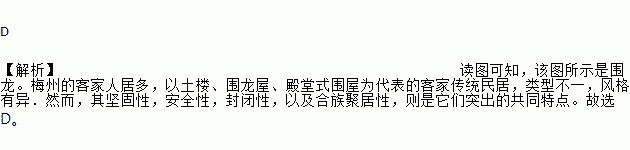 D 【解析】读图可知,该图所示是围龙。梅州的客家人居多,以土楼、围龙屋、殿堂式围屋为代表的客家传统民居,类型不一,风格有异.然而,其坚固性,安全性,封闭性,以及合族聚居性,则是它们突出的共同特点。故选D。