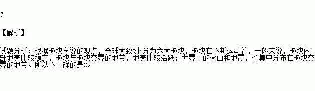C.一般来说,板块内部地壳比较活跃,板块与板块交界的地带,地壳比较稳定。