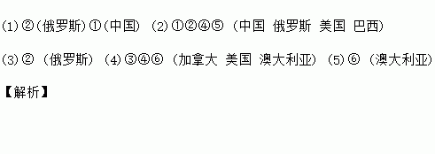 (1)②(俄罗斯)①(中国) (2)①②④⑤ (中国 俄罗斯 美国 巴西) (3)② (俄罗斯) (4)③④⑥ (加拿大 美国 澳大利亚) (5)⑥ (澳大利亚) 【解析】