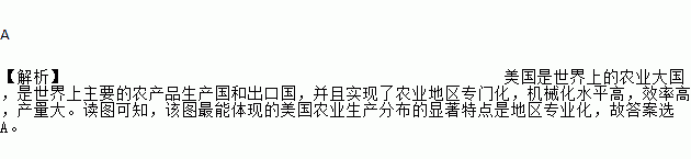 A 【解析】美国是世界上的农业大国,是世界上主要的农产品生产国和出口国,并且实现了农业地区专门化,机械化水平高,效率高,产量大。读图可知,该图最能体现的美国农业生产分布的显著特点是地区专业化,故答案选A。