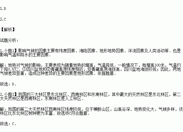 1.造成①、②地理环境差异显著的主要因素是( )