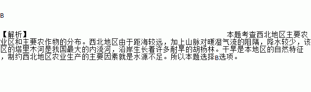 B 【解析】本题考查西北地区主要农业区和主要农作物的分布。西北地区由于距海较远,加上山脉对暖湿气流的阻隔,降水较少,该区的塔里木河是我国最大的内流河,沿岸生长着许多耐旱的胡杨林。干旱是本地区的自然特征,制约西北地区农业生产的主要因素就是水源不足。所以本题选择B选项。