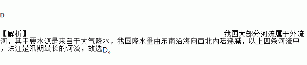 D 【解析】我国大部分河流属于外流河,其主要水源是来自于大气降水,我国降水量由东南沿海向西北内陆递减,以上四条河流中,珠江是汛期最长的河流,故选D。
