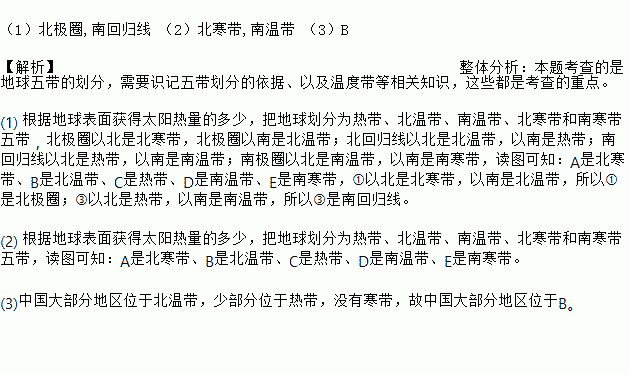 £¨1£©±±¼«È¦,ÄϻعéÏß £¨2£©±±º®´ø,ÄÏδø £¨3£©B ¡¾½âÎö¡¿ÕûÌå·ÖÎö£º±¾Ì⿼²éµÄÊǵØÇòÎå´øµÄ»®·Ö£¬ÐèҪʶ¼ÇÎå´ø»®·ÖµÄÒÀ¾Ý¡¢ÒÔ¼°Î¶ȴøµÈÏà¹ØÖªÊ¶£¬ÕâЩ¶¼ÊÇ¿¼²éµÄÖØµã¡£ (1) ¸ù¾ÝµØÇò±íÃæ»ñµÃÌ«ÑôÈÈÁ¿µÄ¶àÉÙ£¬°ÑµØÇò»®·ÖΪÈÈ´ø¡¢±±Î´ø¡¢ÄÏδø¡¢±±º®´øºÍÄϺ®´øÎå´ø£¬±±¼«È¦ÒÔ±±ÊDZ±º®´ø£¬±±¼«È¦ÒÔÄÏÊDZ±Î´ø£»±±»Ø¹éÏßÒÔ±±ÊDZ±Î´ø£¬ÒÔÄÏÊÇÈÈ´ø£»ÄϻعéÏßÒÔ±±ÊÇÈÈ´ø£¬ÒÔÄÏÊÇÄÏδø£»Äϼ«È¦ÒÔ±±ÊÇÄÏÎÂ...