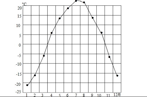 | 气温/°C | -20.1 | -15.8 | -6.0 | 5.8 | 13.9 | 19.7 | 23.3 | 21.6 | 14.3 | 5.6 | -6.7 | -16.8 |