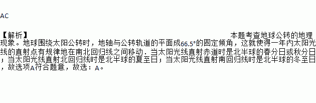 AC 【解析】本题考查地球公转的地理现象。地球围绕太阳公转时,地轴与公转轨道的平面成66.5°的固定倾角,这就使得一年内太阳光线的直射点有规律地在南北回归线之间移动.当太阳光线直射赤道时是北半球的春分日或秋分日;当太阳光线直射北回归线时是北半球的夏至日;当太阳光线直射南回归线时是北半球的冬至日,故选项A符合题意,故选:A。