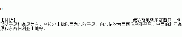 D 【解析】俄罗斯地势东高西低,地形以平原和高原为主,乌拉尔山脉以西为东欧平原,向东依次为西西伯利亚平原、中西伯利亚高原和东西伯利亚山地等。