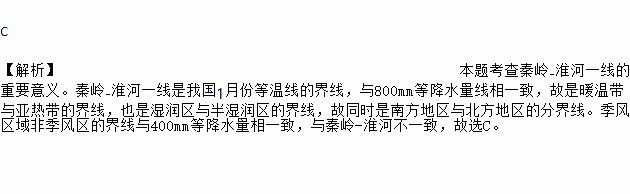 C 【解析】本题考查秦岭-淮河一线的重要意义。秦岭-淮河一线是我国1月份等温线的界线,与800mm等降水量线相一致,故是暖温带与亚热带的界线,也是湿润区与半湿润区的界线,故同时是南方地区与北方地区的分界线。季风区域非季风区的界线与400mm等降水量相一致,与秦岭-淮河不一致,故选C。