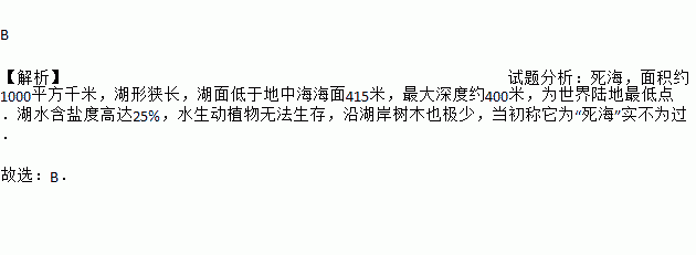 B 【解析】试题分析:死海,面积约1000平方千米,湖形狭长,湖面低于地中海海面415米,最大深度约400米,为世界陆地最低点.湖水含盐度高达25%,水生动植物无法生存,沿湖岸树木也极少,当初称它为“死海”实不为过. 故选:B.