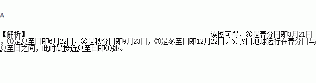 读图,“粽子香,香厨房,艾叶香,香满堂”。今年6月9日是我国传统佳节——端午节,这天地球运行位置最接近图中的( )