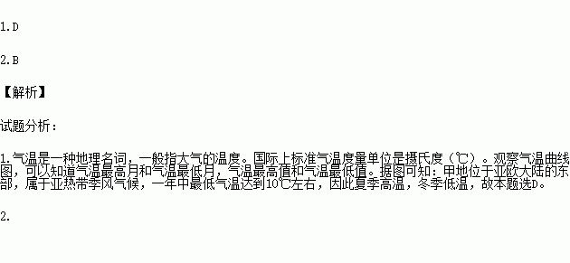 读世界两区域轮廓图中甲、乙两地月平均气温曲线和降水柱状图。回答下列各题。