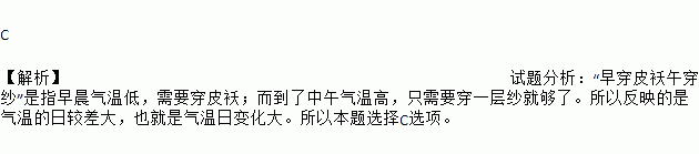 C 【解析】试题分析:“早穿皮袄午穿纱”是指早晨气温低,需要穿皮袄;而到了中午气温高,只需要穿一层纱就够了。所以反映的是气温的日较差大,也就是气温日变化大。所以本题选择C选项。