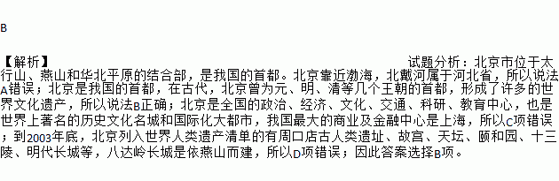 B 【解析】试题分析:北京市位于太行山、燕山和华北平原的结合部,是我国的首都。北京靠近渤海,北戴河属于河北省,所以说法A错误;北京是我国的首都,在古代,北京曾为元、明、清等几个王朝的首都,形成了许多的世界文化遗产,所以说法B正确;北京是全国的政治、经济、文化、交通、科研、教育中心,也是世界上著名的历史文化名城和国际化大都市,我国最大的商业及金融中心是上海,所以C项错误;到2003年底,北京列...