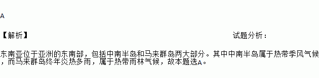 A 【解析】试题分析: 东南亚位于亚洲的东南部,包括中南半岛和马来群岛两大部分。其中中南半岛属于热带季风气候,而马来群岛终年炎热多雨,属于热带雨林气候,故本题选A。