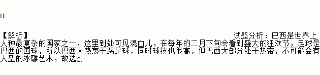 D 【解析】试题分析:巴西是世界上人种最复杂的国家之一,这里到处可见混血儿,在每年的二月下旬会看到盛大的狂欢节,足球是巴西的国球,所以巴西人热衷于踢足球,同时球技也很高,但巴西大部分处于热带,不可能会有大型的冰雕艺术,故选C.