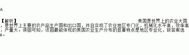 A 【解析】美国是世界上的农业大国,是世界上主要的农产品生产国和出口国,并且实现了农业地区专门化,机械化水平高,效率高,产量大。读图可知,该图最能体现的美国农业生产分布的显著特点是地区专业化,故答案选A。