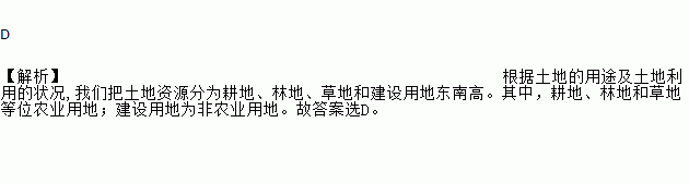 D 【解析】根据土地的用途及土地利用的状况,我们把土地资源分为耕地、林地、草地和建设用地东南高。其中,耕地、林地和草地等位农业用地;建设用地为非农业用地。故答案选D。