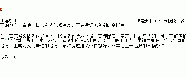 B ¡¾½âÎö¡¿ÊÔÌâ·ÖÎö£ºÔÚÆøºòÑ×ÈȶàÓêµÄµØ·½£¬µ±µØÃñ¾ÓΪÊÊÓ¦ÆøºòÌØµã£¬¿É½¨Ôìͨ·ç·À³±µÄ¸ß½ÅÎÝ£® ¡¾½âÎö¡¿ ÔÚÆøºòÑ×ÈȶàÓêµÄÇøÓò£¬Ãñ¾Ó¶àÖñÂ¥»òľ¥£¬¸ß½ÅÎÝÊôÓÚÄÏ·½¸ÉÀ¸Ê½½¨ÖþµÄÒ»ÖÖ£®ËüµÄ·¿¶¥³Ê¡°ÈË¡±×ÖÐÍ£¬Ò×ÓÚÅÅË®£¬²»»áÔì³É»ýË®µÄÇé¿ö³öÏÖ£®µ×²ãÒ»°ã²»×¡ÈË£¬ÊÇËÇÑø¼ÒÇÝ£¬¶Ñ·Å²ñ²ÝµÄµØ·½£®ÉϲãΪÈËÃǾÓסµÄµØ·½£®¸ÃÖÖ·¿ÎÝͨ·çÌõ¼þ¼«ºÃ£¬·Ç³£ÊÊÒËÓÚʪÈÈµÄÆøºòÌõ¼þ£® ¹ÊÑ¡£ºB£®