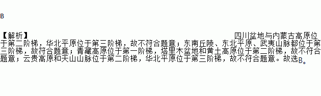 B 【解析】四川盆地与内蒙古高原位于第二阶梯,华北平原位于第三阶梯,故不符合题意;东南丘陵、东北平原、武夷山脉都位于第三阶梯,故符合题意;青藏高原位于第一阶梯,塔里木盆地和黄土高原位于第二阶梯,故不符合题意;云贵高原和天山山脉位于第二阶梯,华北平原位于第三阶梯,故不符合题意。故选B。