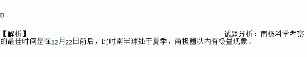 D 【解析】试题分析:南极科学考察的最佳时间是在12月22日前后,此时南半球处于夏季,南极圈以内有极昼现象.