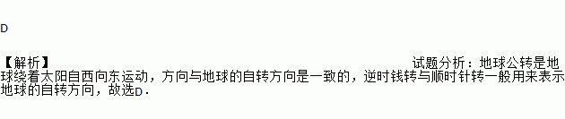 D 【解析】试题分析:地球公转是地球绕着太阳自西向东运动,方向与地球的自转方向是一致的,逆时钱转与顺时针转一般用来表示地球的自转方向,故选D.
