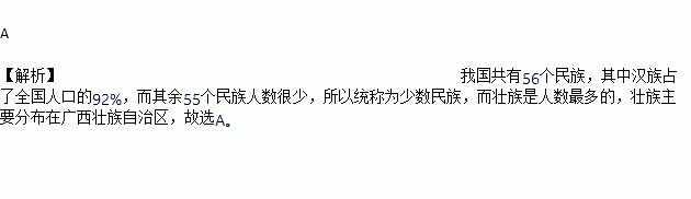 “五十六个民族,五十六枝花,五十六个兄弟姐妹是一家……”,这首歌曲唱出了各族人民的心声。请你判断,我国人口最多的少数民族主要所在省(区)是