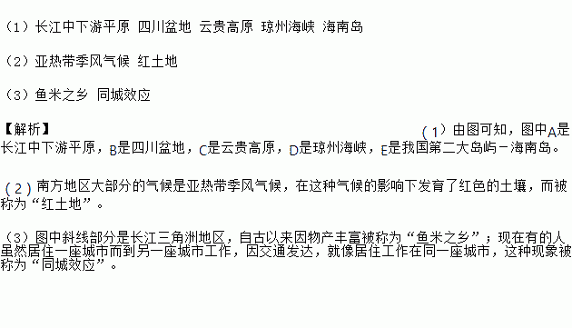 £¨1£©³¤½ÖÐÏÂÓÎÆ½Ô ËÄ´¨ÅèµØ ÔÆ¹ó¸ßÔ ÇíÖݺ£Ï¿ º£Äϵº £¨2£©ÑÇÈÈ´ø¼¾·çÆøºò ºìÍÁµØ £¨3£©ÓãÃ×Ö®Ïç ͬ³ÇЧӦ ¡¾½âÎö¡¿£¨1£©ÓÉͼ¿ÉÖª£¬Í¼ÖÐAÊdz¤½ÖÐÏÂÓÎÆ½Ô£¬BÊÇËÄ´¨ÅèµØ£¬CÊÇÔÆ¹ó¸ßÔ£¬DÊÇÇíÖݺ£Ï¿£¬EÊÇÎÒ¹úµÚ¶þ´óµºÓ죺£Äϵº¡£ £¨2£©ÄÏ·½µØÇø´ó²¿·ÖµÄÆøºòÊÇÑÇÈÈ´ø¼¾·çÆøºò£¬ÔÚÕâÖÖÆøºòµÄÓ°ÏìÏ·¢ÓýÁ˺ìÉ«µÄÍÁÈÀ£¬¶ø±»³ÆÎª¡°ºìÍÁµØ¡±¡£ £¨3£©Í¼ÖÐбÏß²¿·ÖÊdz¤½Èý½ÇÖÞµØ...