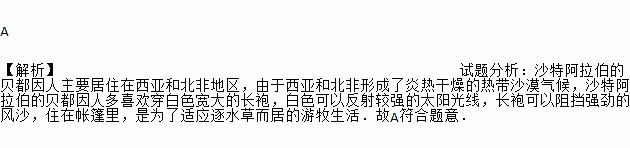A 【解析】试题分析:沙特阿拉伯的贝都因人主要居住在西亚和北非地区,由于西亚和北非形成了炎热干燥的热带沙漠气候,沙特阿拉伯的贝都因人多喜欢穿白色宽大的长袍,白色可以反射较强的太阳光线,长袍可以阻挡强劲的风沙,住在帐篷里,是为了适应逐水草而居的游牧生活.故A符合题意.