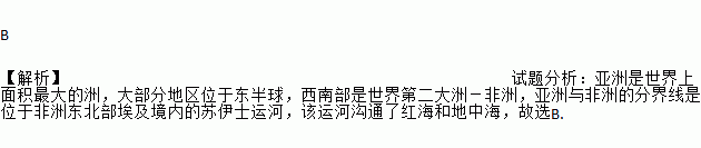 B 【解析】试题分析:亚洲是世界上面积最大的洲,大部分地区位于东半球,西南部是世界第二大洲-非洲,亚洲与非洲的分界线是位于非洲东北部埃及境内的苏伊士运河,该运河沟通了红海和地中海,故选B.