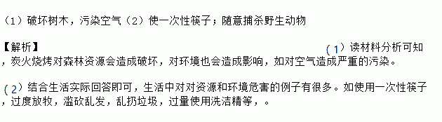(1)破坏树木,污染空气(2)使一次性筷子;随意捕杀野生动物 【解析】(1)读材料分析可知,炭火烧烤对森林资源会造成破坏,对环境也会造成影响,如对空气造成严重的污染。 (2)结合生活实际回答即可,生活中对对资源和环境危害的例子有很多。如使用一次性筷子,过度放牧,滥砍乱发,乱扔垃圾,过量使用洗洁精等,。
