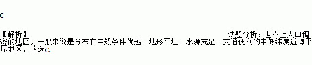 C 【解析】试题分析:世界上人口稠密的地区,一般来说是分布在自然条件优越,地形平坦,水源充足,交通便利的中低纬度近海平原地区,故选C.