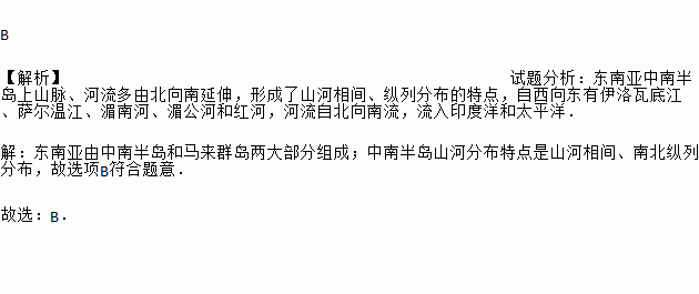 B ¡¾½âÎö¡¿ÊÔÌâ·ÖÎö£º¶«ÄÏÑÇÖÐÄϰ뵺ÉÏɽÂö¡¢ºÓÁ÷¶àÓɱ±ÏòÄÏÑÓÉ죬ÐγÉÁËɽºÓÏà¼ä¡¢×ÝÁзֲ¼µÄÌØµã£¬×ÔÎ÷Ïò¶«ÓÐÒÁÂåÍßµ×½¡¢Èø¶ûν¡¢äØÄϺӡ¢äع«ºÓºÍºìºÓ£¬ºÓÁ÷×Ô±±ÏòÄÏÁ÷£¬Á÷ÈëÓ¡¶ÈÑóºÍ̫ƽÑó£® ¡¾½âÎö¡¿ ¶«ÄÏÑÇÓÉÖÐÄϰ뵺ºÍÂíÀ´ÈºµºÁ½´ó²¿·Ö×é³É£»ÖÐÄϰ뵺ɽºÓ·Ö²¼ÌصãÊÇɽºÓÏà¼ä¡¢Äϱ±×ÝÁзֲ¼£¬¹ÊÑ¡ÏîB·ûºÏÌâÒ⣮ ¹ÊÑ¡£ºB£®