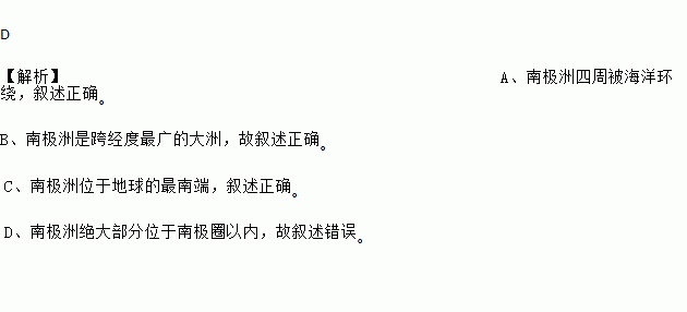 C. 南极洲位于地球的最南端 D. 南极洲全部位于南极圈以内