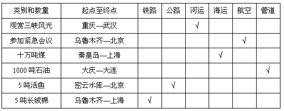 根据以下不同情况,选择最适宜的交通运输方式,在表中用“√”表示。