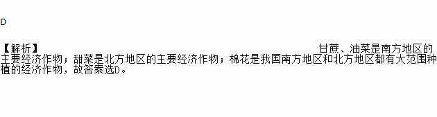 D 【解析】甘蔗、油菜是南方地区的主要经济作物;甜菜是北方地区的主要经济作物;棉花是我国南方地区和北方地区都有大范围种植的经济作物,故答案选D。
