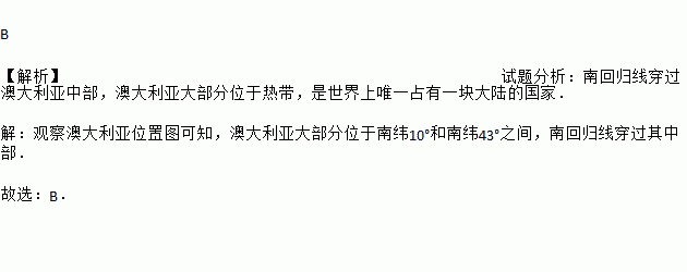 B 【解析】试题分析:南回归线穿过澳大利亚中部,澳大利亚大部分位于热带,是世界上唯一占有一块大陆的国家. 【解析】 观察澳大利亚位置图可知,澳大利亚大部分位于南纬10°和南纬43°之间,南回归线穿过其中部. 故选:B.