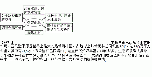 热带雨林有“地球之肺”之称,请在下面方框中将热带雨林的作用填写完整。