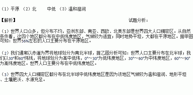(2)据乙图分析,世界人口主要分布在南北半球的 半球;按纬度来说,世界人口主要分布在 纬度地区。