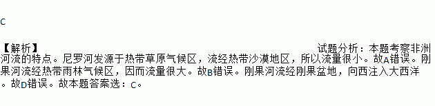 C 【解析】试题分析:本题考察非洲河流的特点。尼罗河发源于热带草原气候区,流经热带沙漠地区,所以流量很小。故A错误。刚果河流经热带雨林气候区,因而流量很大。故B错误。刚果河流经刚果盆地,向西注入大西洋。故D错误。故本题答案选:C。