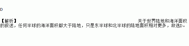 D 【解析】关于世界陆地和海洋面积的叙述,任何半球的海洋面积都大于陆地,只是东半球和北半球的陆地面积相对更多,故选D。