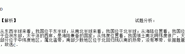 D 【解析】试题分析: 从东西半球来看,我国位于东半球;从南北半球来看,我国位于北半球;从海陆位置看,我国位于亚洲东部,太平洋的西岸,是海陆兼备的国家;从纬度位置看,我国领土南北跨纬度很广,大部分位于中纬度地区,属北温带,南部少数地区位于北回归线以南的热带,没有寒带.依据题意,故选C.
