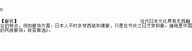 D 【解析】当代日本文化具有东西融合的特点。例如服饰方面:日本人平时多穿西装和便服,只是在节庆之日才穿和服。旗袍是中国的民族服饰;故答案选D。
