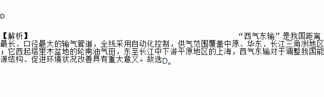 D 【解析】“西气东输”是我国距离最长、口径最大的输气管道,全线采用自动化控制,供气范围覆盖中原、华东、长江三角洲地区;它西起塔里木盆地的轮南油气田,东至长江中下游平原地区的上海,西气东输对于调整我国能源结构、促进环境状况改善具有重大意义。故选D。