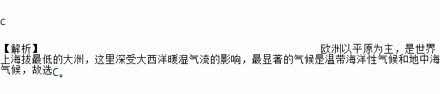 C 【解析】欧洲以平原为主,是世界上海拔最低的大洲,这里深受大西洋暖湿气流的影响,最显著的气候是温带海洋性气候和地中海气候,故选C。