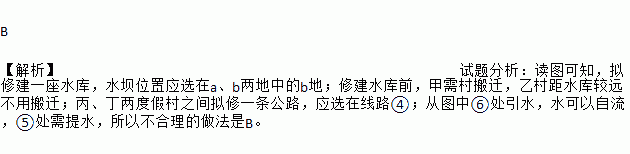 B ¡¾½âÎö¡¿ÊÔÌâ·ÖÎö£º¶Áͼ¿ÉÖª£¬ÄâÐÞ½¨Ò»×ùË®¿â£¬Ë®°ÓλÖÃӦѡÔÚa¡¢bÁ½µØÖеÄbµØ£»ÐÞ½¨Ë®¿âǰ£¬¼×Ðè´å°áǨ£¬ÒÒ´å¾àË®¿â½ÏÔ¶²»ÓðáǨ£»±û¡¢¶¡Á½¶È¼Ù´åÖ®¼äÄâÐÞÒ»Ìõ¹«Â·£¬Ó¦Ñ¡ÔÚÏß·¢Ü£»´ÓͼÖТ޴¦ÒýË®£¬Ë®¿ÉÒÔ×ÔÁ÷£¬¢Ý´¦ÐèÌáË®£¬ËùÒÔ²»ºÏÀíµÄ×ö·¨ÊÇB¡£