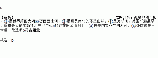D 【解析】试题分析:观察地图可知,①是世界第四大河﹣﹣密西西比河;②是纵贯南北的落基山脉;③是洛杉矶,美国兴起最早、规模最大的高新技术产业中心﹣硅谷在旧金山附近;④按美国农业带的划分,④处应该是玉米带.故选项D符合题意. 故选:D.